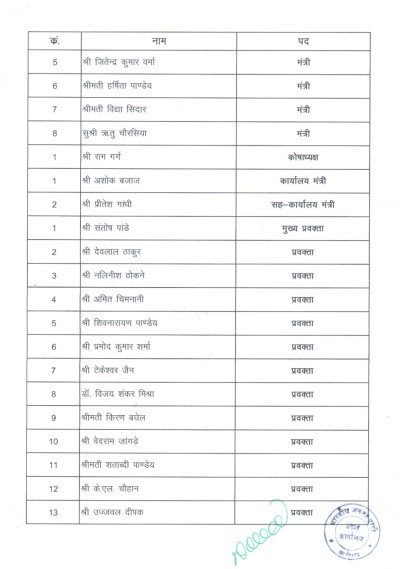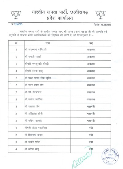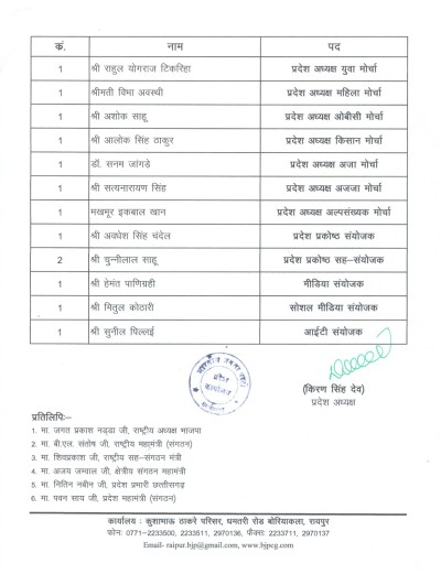 राजनीतिक जानकार बताते हैं कि, इस टीम को बनाने के लिए संगठन मंत्री पवन साय, क्षेत्रीय संगठन मंत्री अजय जामवाल, सह संगठन मंत्री शिवप्रताप सिंह, राष्ट्रीय महामंत्री बीएल संतोष, प्रभारी नितिन नबीन के अलावा मुख्य़मंत्री विष्णु देव साय के साथ किरण सिंहदेव ने चर्चा कर घोषणा की है। देखिए सूची.