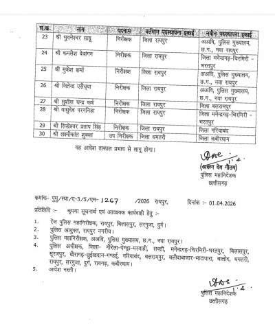 रायपुर। छत्तीसगढ़ पुलिस विभाग में बड़े स्तर पर फेरबदल किया गया है। पुलिस मुख्यालय ने कुल 30 पुलिसकर्मियों के तबादले का आदेश जारी किया है, जिसमें 29 निरीक्षक और 1 उप निरीक्षक शामिल हैं।