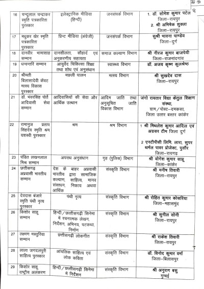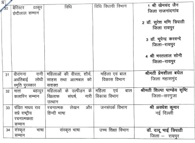 रायपुर। छत्तीसगढ़ सरकार ने राज्य अलंकरण पुरस्कारों की घोषणा का ऐलान कर दिया है। इस अवसर पर संस्कृति मंत्री राजेश अग्रवाल ने जानकारी दी कि, राज्योत्सव समापन समारोह में उपराष्ट्रपति सी.पी. राधाकृष्णन पुरस्कार विजेताओं को सम्मानित करेंगे। इस वर्ष कुल 34 अलंकरण पुरस्कारों की घोषणा की गई है और 40 लोगों को विभिन्न क्षेत्रों में उनके उत्कृष्ट योगदान के लिए सम्मानित किया जाना है।