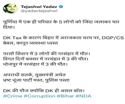 विपक्षी दलों ने नीतीश कुमार के नेतृत्व वाली बिहार सरकार पर निशाना साधते हुए आरोप लगाया कि, राज्य में कानून-व्यवस्था ध्वस्त हो गई है। विधानसभा में विपक्ष के नेता तेजस्वी यादव ने हाल ही में बिहार में हुई कई अन्य हत्याओं को सूचीबद्ध किया था। राजद नेता ने एक्स पर एक पोस्ट में कहा कि, पूर्णिया में एक ही परिवार के पांच लोगों को जिंदा जलाकर मार दिया गया। डीके टैक्स के कारण बिहार में अराजकता चरम पर, डीजीपी/मुख्य सचिव बेबस, कानून व्यवस्था ध्वस्त। यादव पिछले कुछ महीनों से ‘डीके टैक्स’ के बारे में बोलते रहे हैं, लेकिन उन्होंने कभी यह स्पष्ट नहीं किया कि डीके कौन है या क्या है। उन्होंने कहा, ‘‘परसों सिवान में तीन लोगों की नरसंहार में मौत। विगत दिनों बक्सर में नरसंहार में तीन की मौत। भोजपुर में नरसंहार में तीन की मौत। अपराधी सतर्क, मुख्यमंत्री अचेत। डीके की मौज क्योंकि डीके ही असल बॉस।