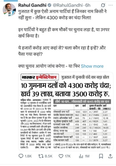 गुजरात। भारत में समय-समय पर राजनीतिक दलों की तरफ से लिए गए चंदे पर बवाल देखने को मिलता रहा है। कभी लेने वाले राजनीतिक दल कटघरे में खड़े होते तो कई बार चंदा देने वालों को लेकर सवाल किए जाते हैं। एक मीडिया रिपोर्ट ने बड़ा खुलासा किया है कि, गुजरात के 10 गुमनाम राजनीतिक दलों को पिछले 5 साल में 4300 करोड़ रुपए का चंदा मिला है। अब इसको लेकर राहुल गांधी ने तंज कसा है।