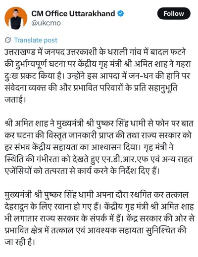 सीएम पुष्कर सिंह धामी ने एक्स पर लिखकर दुख व्यक्त किया "धराली क्षेत्र में बादल फटने से हुए भारी नुकसान का समाचार अत्यंत दुःखद एवं पीड़ादायक है। राहत एवं बचाव कार्यों के लिए SDRF, NDRF, जिला प्रशासन तथा अन्य संबंधित टीमें युद्ध स्तर पर जुटी हुई हैं। वरिष्ठ अधिकारियों से लगातार संपर्क में हूं और स्थिति की गहन निगरानी कर रहा हूं। ईश्वर से सभी के सकुशल होने की प्रार्थना करता हूं।"