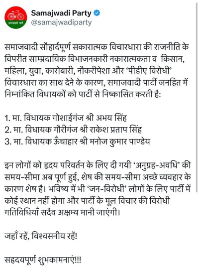 पार्टी प्रवक्ता फखरुल हसन चांद ने कहा कि, पार्टी से निष्कासित तीनों विधायक लगातार PDA के खिलाफ बोल रहे थे। जबकि चार अन्य का हृदय परिवर्तन देखने को मिला है। उन्होंने पीडीए के प्रति अपनी आस्था दिखाई है, लिहाजा उन पर एक्शन नहीं लिया गया है।