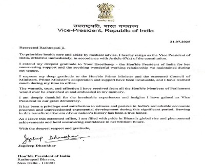 दिल्ली। देश की राजधानी दिल्ली से बड़ी खबर निकल कर आ रही है कि उपराष्ट्रपति जगदीप धनखड़ ने स्वास्थ्य कारणों का हवाला देते हुए अपने पद से त्यागपत्र दे दिया है। राष्ट्रपति द्रौपदी मुर्मू को दिए अपने इस्तीफे में उन्होंने कहा कि, स्वास्थ्य सेवा को प्राथमिकता देने और चिकित्सीय सलाह का पालन करने के लिए मैं संविधान के अनुच्छेद 67(ए) के अनुसार, तत्काल प्रभाव से भारत के उपराष्ट्रपति पद से इस्तीफा देता हूं।