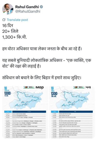 देश के नेताप्रतिपक्ष राहुल गांधी ने कहा कि, इस यात्रा में 16 दिन में 20 जिलों में कुल 1300 किमी की दूरी तय की जाएगी। उन्होंने एक्स पर पोस्ट किया, 'हम वोटर अधिकार यात्रा लेकर जनता के बीच आ रहे हैं। यह सबसे बुनियादी लोकतांत्रिक अधिकार, ‘एक व्यक्ति, एक वोट’ की रक्षा की लड़ाई है। संविधान को बचाने के लिए बिहार में हमारे साथ जुड़िए।
